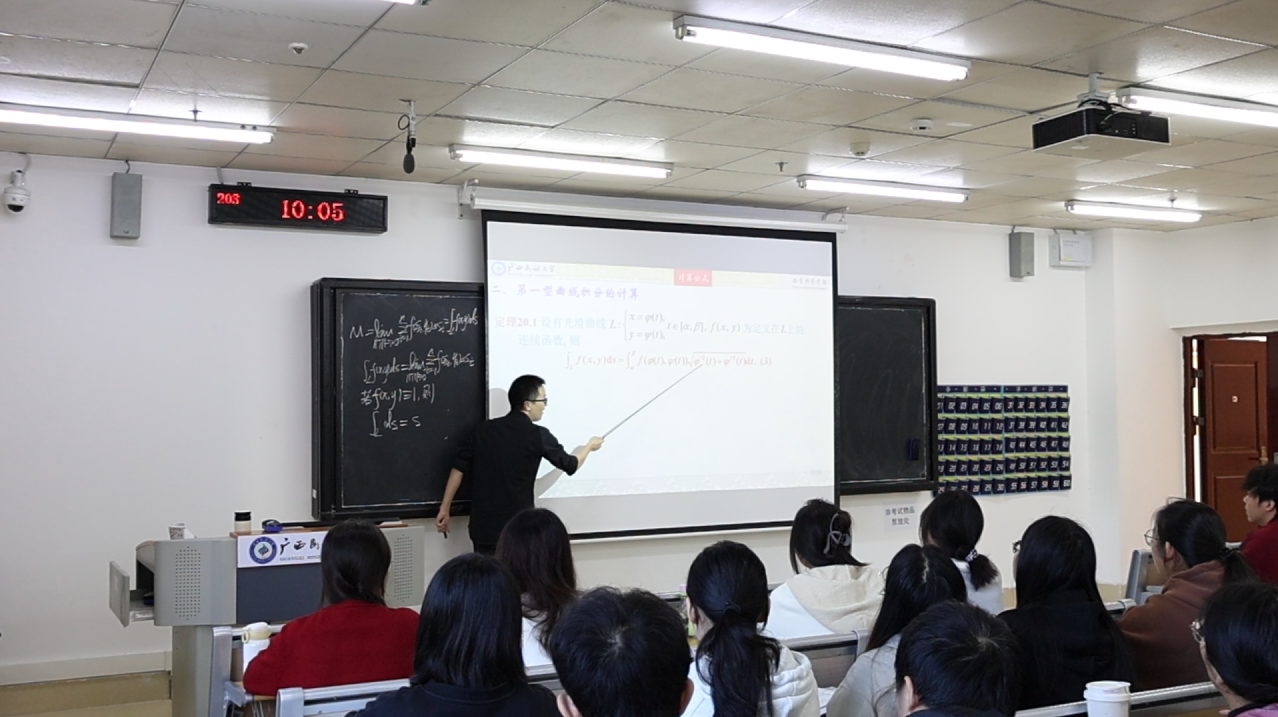 尹江华老师以计算非均匀分布的钢丝索道、项链等质量问题导入,通过借助微元法,引出“第一型曲线积分”概念。授课中注重数学建模能力的培养,深入浅出、循循善诱,鼓励学生用数学工具解决实际问题,助力科技应用落地。最后总结第一型曲线积分计算步骤并布置实践作业,课堂氛围融洽,学生参与度高。